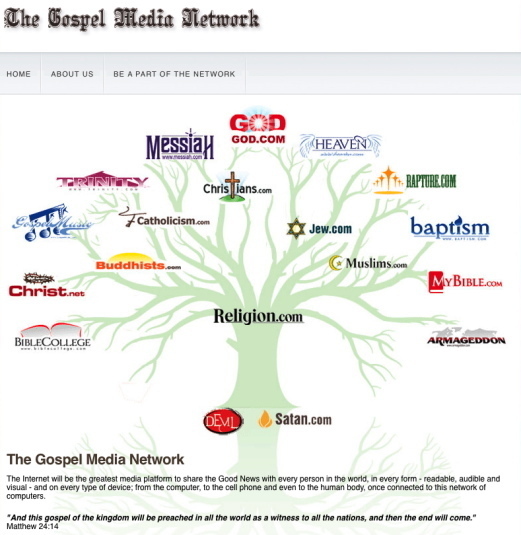 C’est ainsi que le Gospel Media Network possède aujourd’hui, à lui seul, plusieurs milliers de noms de domaine, à commencer par religion.com, mais aussi god.com ou heaven.com, ou encore christ.net. trinity.com, baptism.com, armageddon.com et bien d’autres. Le Gospel Media Network ne s’est pas limité au christianisme : il posède des noms de domaine clés en langue anglaise relatifs aux bouddhistes, aux musulmans ou aux juifs. Sans oublier satan.com : autant le contrôler à titre préventif !